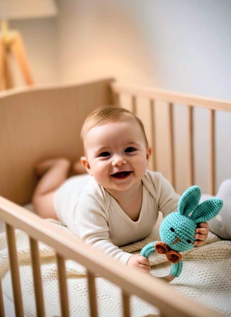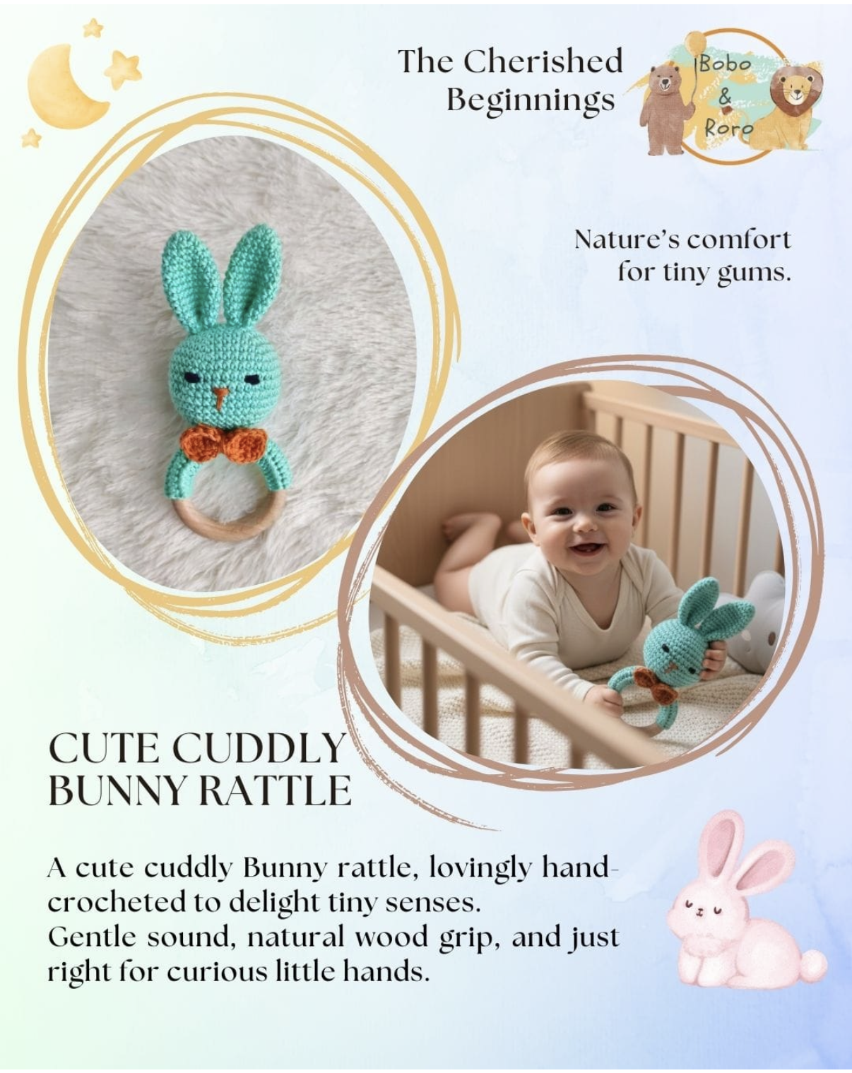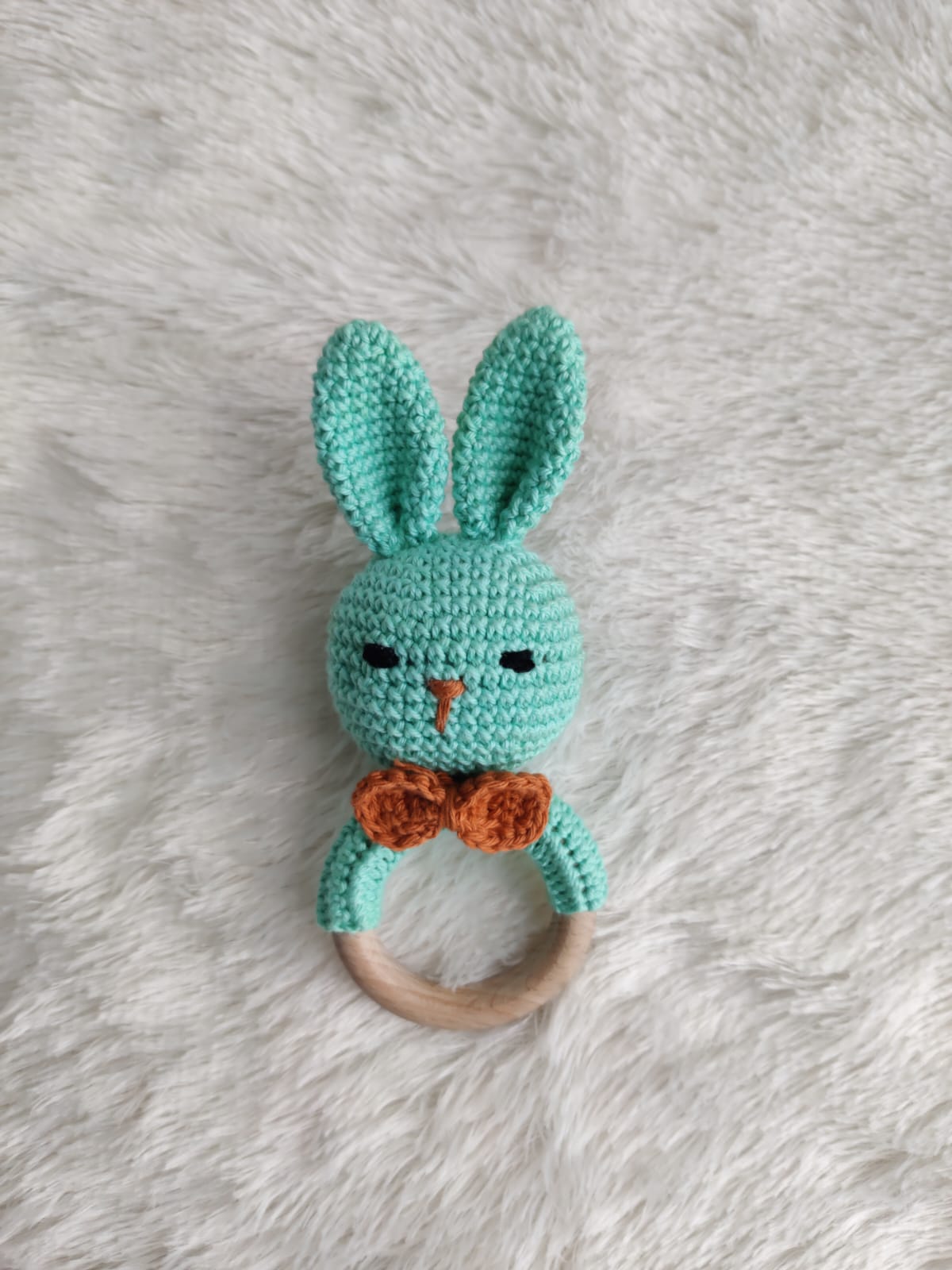 A Cute cuddly bunny rattle,lovingly hand-crocheted to delight tiny senses.