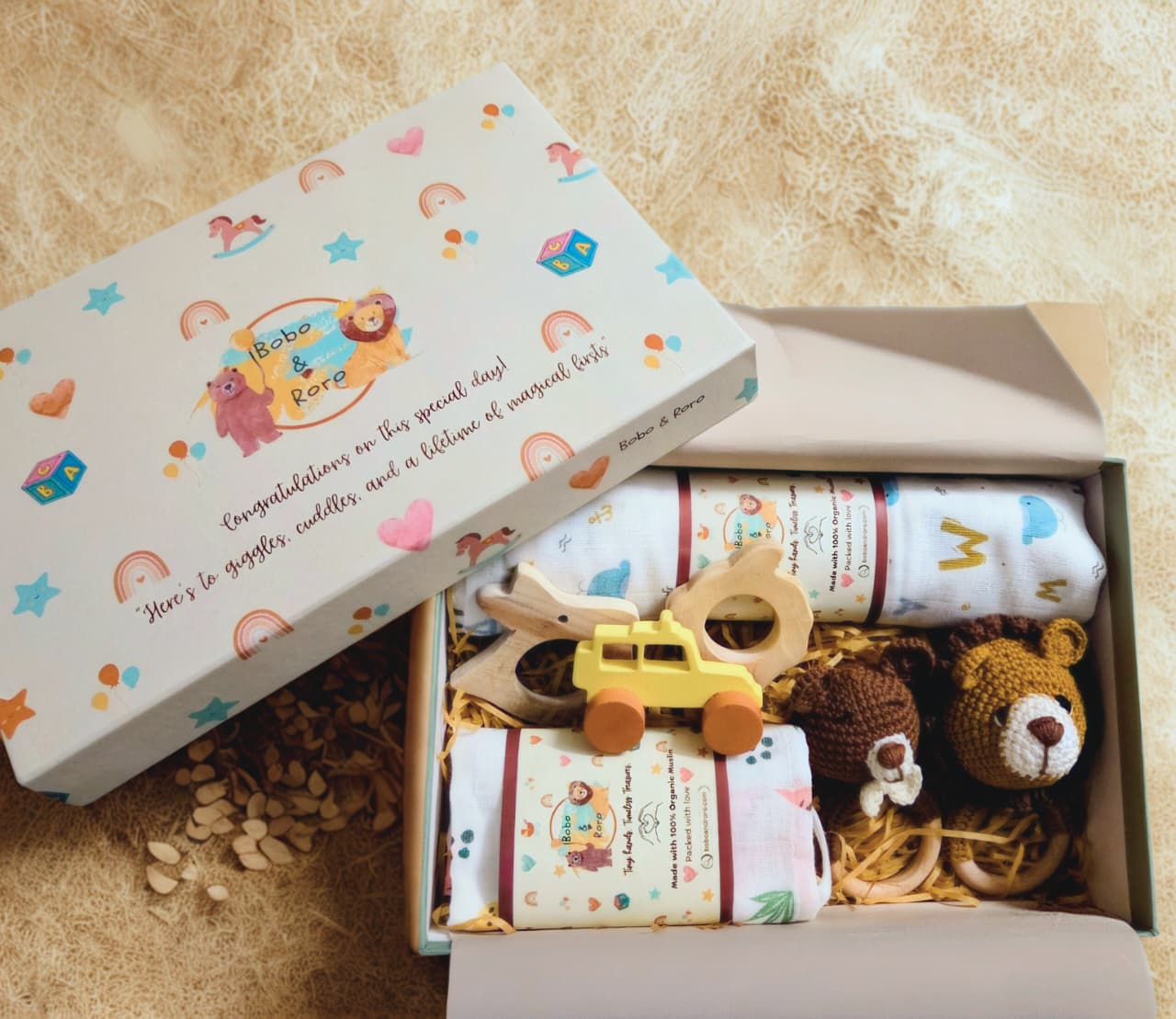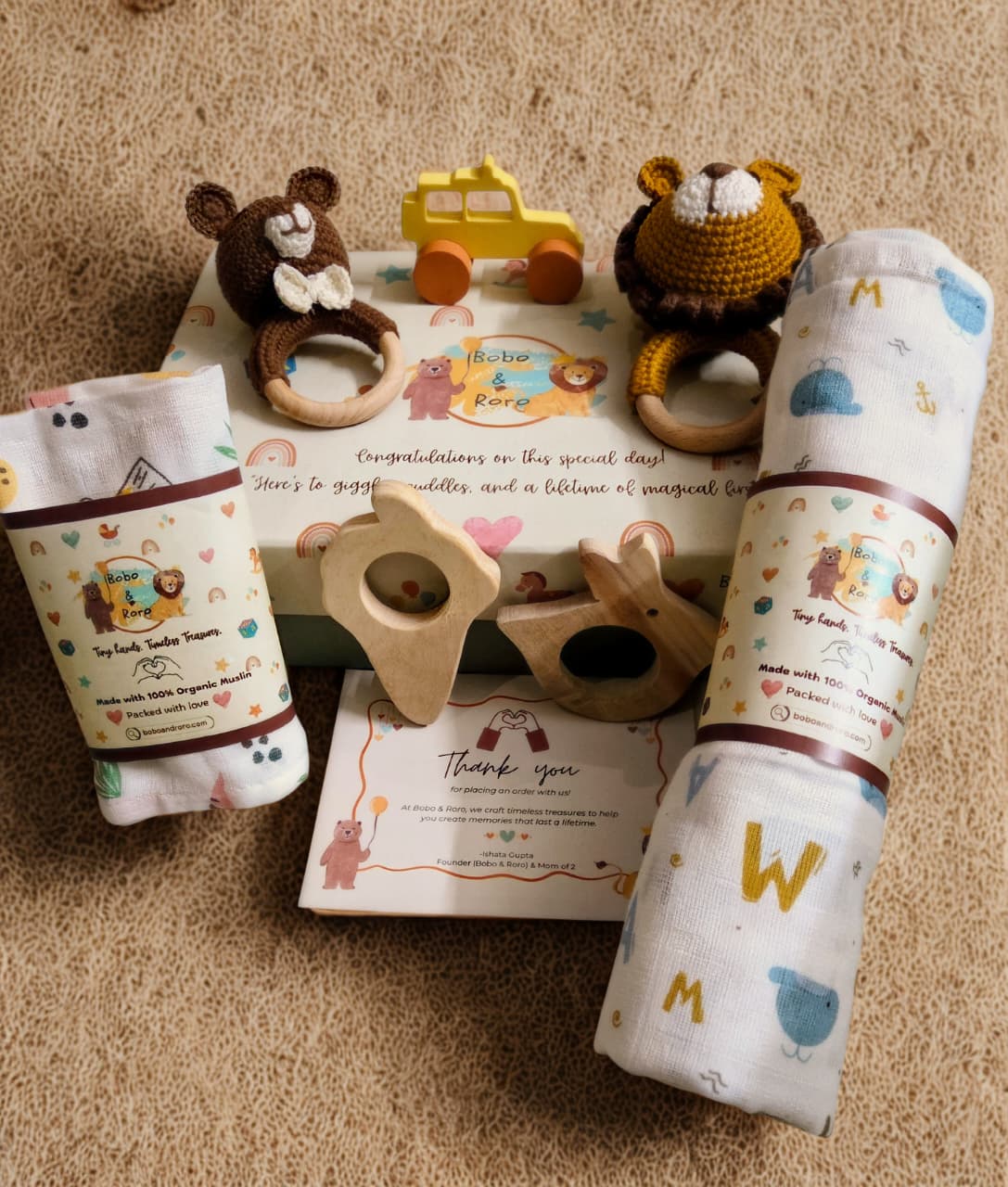 This one has a breathable organic muslin swaddle,3 clouds soft muslin washcloths, a smooth, lovely first wooden toy car,2 Neem wood  natural Teethers and a pair of our signature handmade crocheted rattles- Bobo & Roro.