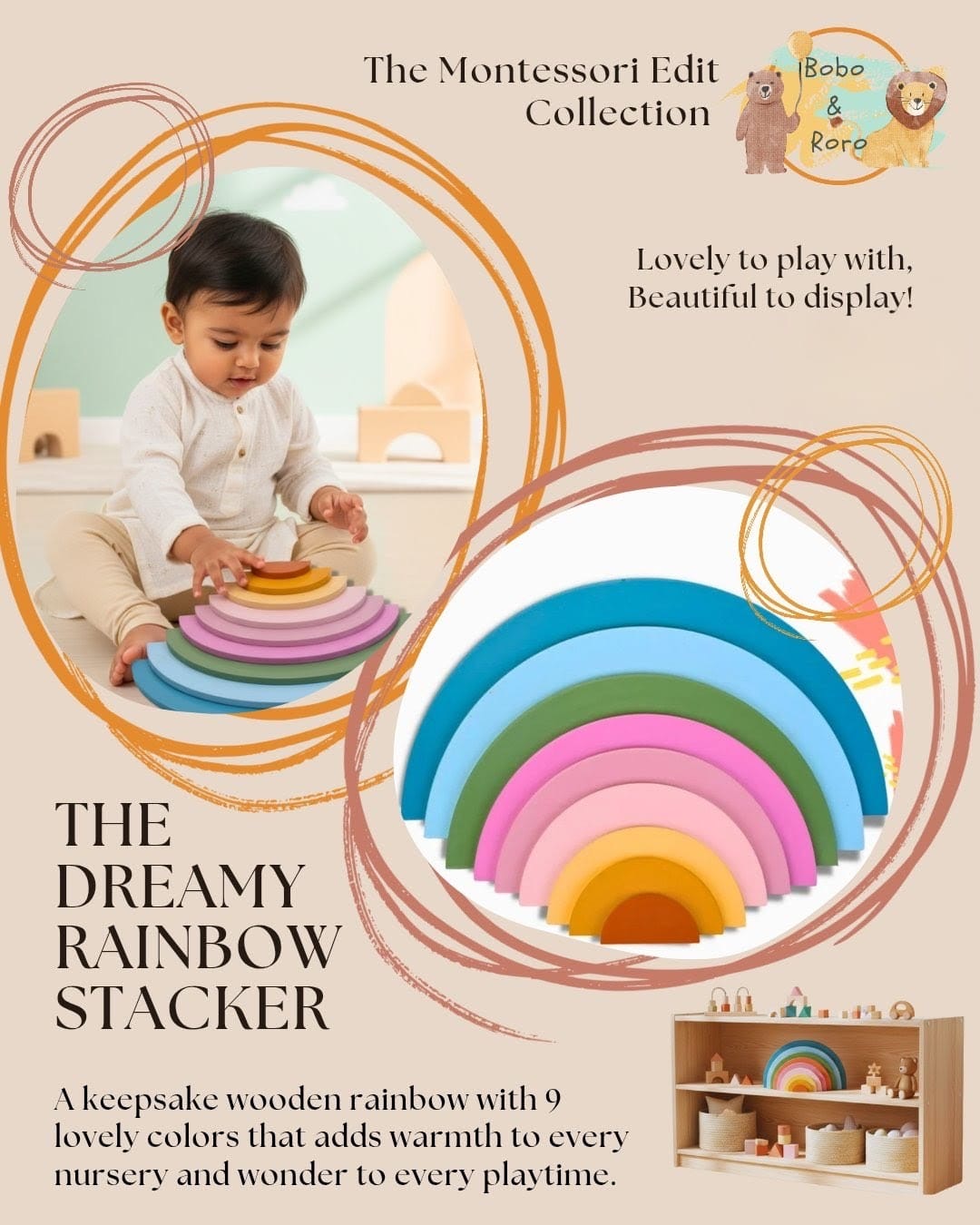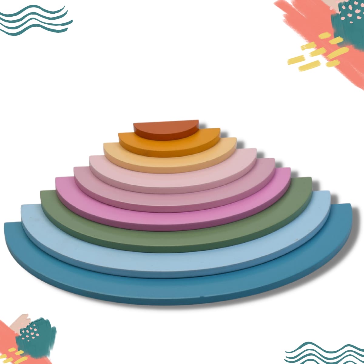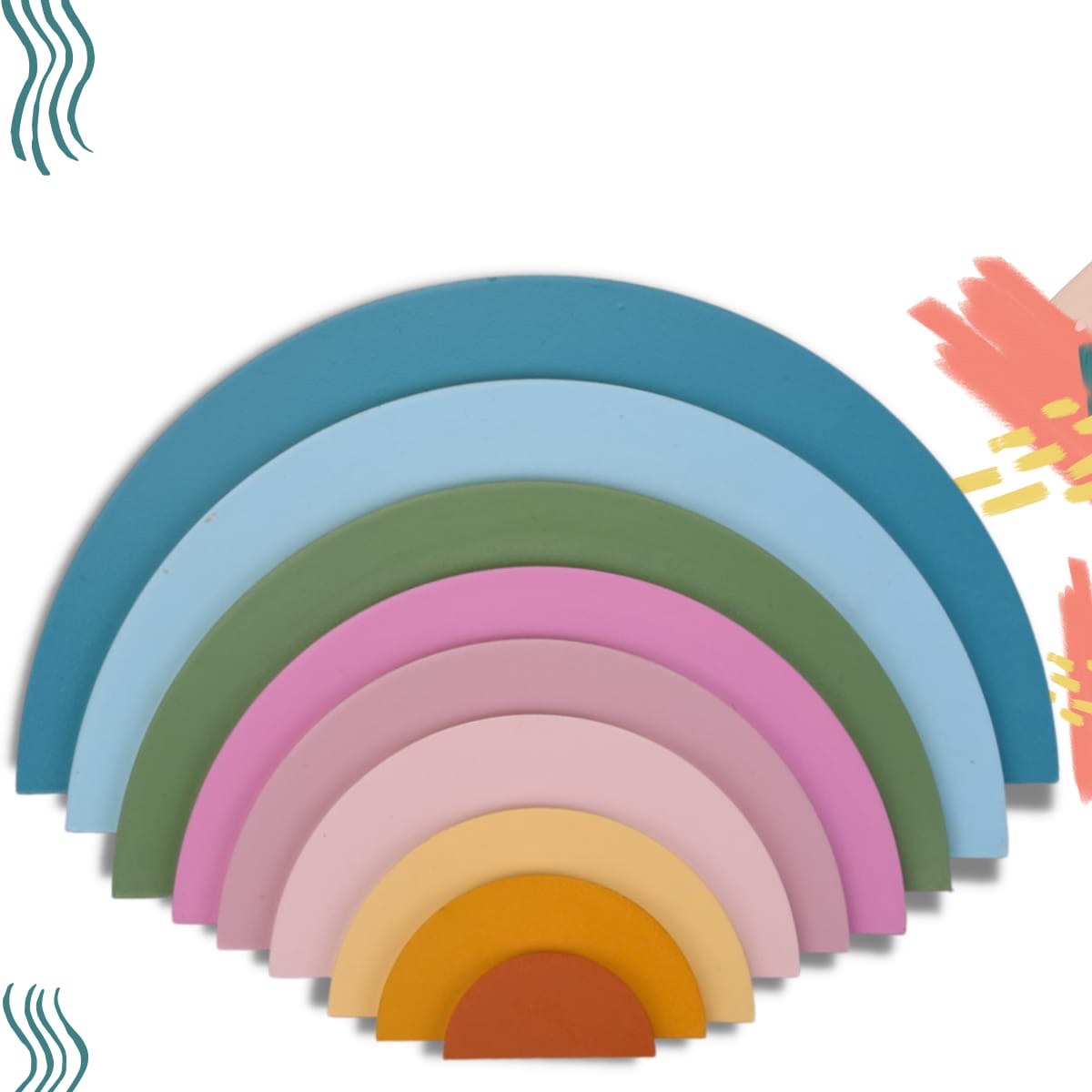 A keepsake wooden rainbow with 9 lovely colours that adds warmth to every nursery and wonder to every playtime.